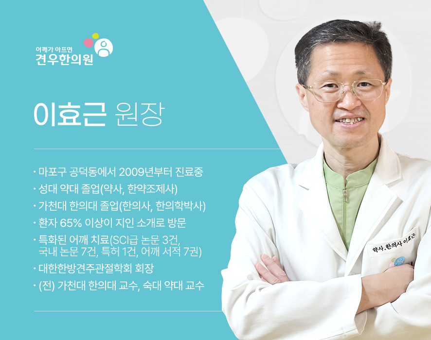 견우한의원은 2007년부터 20년간 어깨를 집중적으로 치료하면서 매년 2만명 전후의 어깨통증 환자를 집중 치료하고 있으며, 꾸준한 연구를 통해 국내외 논문 10편(SCI급 3건), 특허 1건, 어깨 서적 7권을 출간하였습니다.